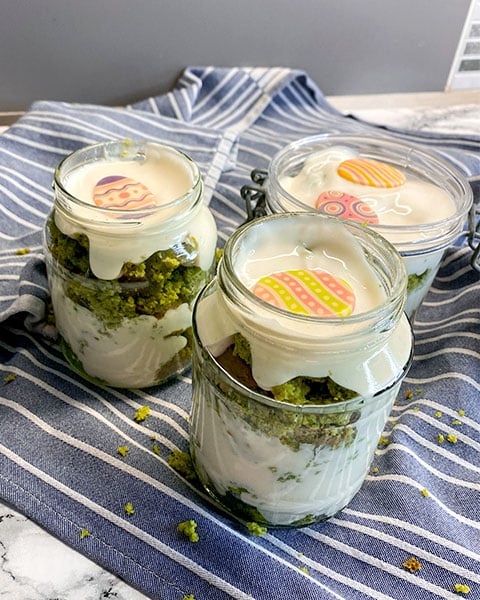 Den Backofen auf 180°C vorheizen. Spinat, Kokosmilch, Ei und Zitronensaft vermischen. In einer großen Schüssel Mehl, Eiweiß, Xylit, Backpulver, Vanillepaste und Zitronenschale vermischen. Dann die vermengten Zutaten zu der Mischung geben. Den entstandenen Teig in eine kleinere Kuchenform füllen und 20-25 Minuten backen. In der Zwischenzeit die Creme zubereiten - alle Zutaten für die Creme verrühren. Den abgekühlten Kuchen zerbröseln und den Boden der Gläser damit füllen. In die nächste Schicht die Creme geben, dann den Mantel und wieder die Creme. Mit einem Schokoladenei dekorieren.